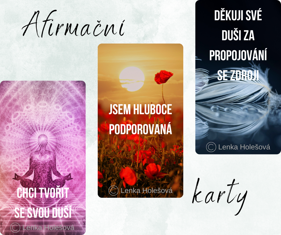 Karty ve formátu PDF s pozitivními afirmacemi, které ti pomohou změnit tvůj mindset. Afirmace na určité téma, ale také afirmační karty tvořené na míru pro daného člověka.